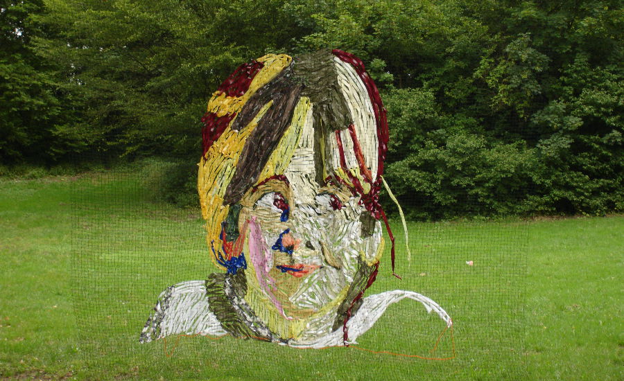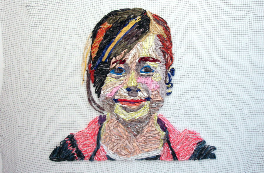 "Die Loge - Hommage an Max Beckmann" (Kunststoffgarn auf PVC-Netz)