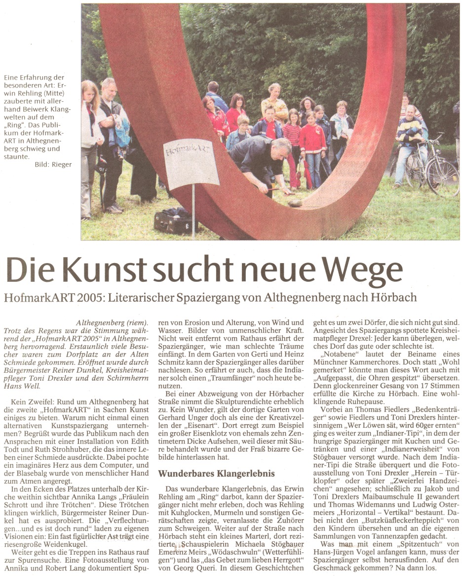 HofmarkART 2005: Literarischer Spaziergang von Althegnenberg nach HörbachAlthegnenberg- Trotz des Regens war die Stimmung während der "HofmarkART 2005" in Althegnenberg hervorragend. Erstaunlich viele Besucher waren zum Dorfplatz an der Alten Schmiede gekommen. Eröffnet wurde durch Bürgermeister Reiner Dunkel, Kreisheimatpfleger Toni Drexler und den Schirmherrn Hans Well. Kein Zweifel: Rund um Althegnenberg hat die zweite "HofmarkART" in Sachen Kunst einiges zu bieten. Warum nicht einmal einen alternativen Kunstspaziergang unternehmen? Begrüßt wurde das Publikum nach den Ansprachen mit einer Installation von Edith Todt und Ruth Strohhuber, die das innere Leben einer Schmiede ausdrückte. Dabei pochte ein imaginäres Herz aus dem Computer, und der Blasebalg wurde von menschlicher Hand zum Atmen angeregt. In den Ecken des Platzes unterhalb der Kirche weithin sichtbar Annika Langs "Fräulein Schrott und ihre Trötchen". Diese Trötchen klingen wirklich, Bürgermeister Reiner Dunkel hat es ausprobiert. Die "Verflechtungen...und es ist doch rund" laden zu eigenen Visionen ein: Ein fast figürlicher Ast trägt eine riesengroße Weidenkugel. Weiter geht es die Treppen ins Rathaus rauf zur Spurensuche. Eine Fotoausstellung von Annika und Robert Lang dokumentiert Spuren von Erosion und Alterung, von Wind und Wasser. Bilder von unmenschlicher Kraft. Nicht weit entfernt vom Rathaus erfährt der Spaziergänger, wie man schlechte Träume einfängt. In dem Garten von Gerti und Heinz Schmitz kann der Spaziergänger alles darüber nachlesen. So erfährt er auch, dass die Indianer solch einen "Traumfänger" noch heute benutzen. Bei einer Abzweigung von der Hörbacher Straße nimmt die Skulpturendichte erheblich zu. Kein Wunder, gilt der dortige Garten von Gerhard Unger doch als eine der Kreativzellen der "Eisenart". Dort erregt zum Beispiel ein großer Eisenklotz von ehemals zehn Zentimetern Dicke Aufsehen, weil dieser mit Säure behandelt wurde und der Fraß bizarre Gebilde hinterlassen hat. Wunderbares Klangerlebnis Das wunderbare Klangerlebnis, das Erwin Rehling am "Ring" darbot, kann der Spaziergänger nicht mehr erleben, doch was Rehling mit Kuhglocken, Murmeln und sonstigen Gerätschaften zeigte, veranlasste die Zuhörer zum Schweigen. Weiter auf der Straße nach Hörbach steht ein kleines Marterl, dort rezitierte Schauspielerin Michaela Stögbauer Emerenz Meirs "Wödaschwuln" (Wetterfühligen") und las "das Gebet zum lieben Herrgott" von Georg Queri. In diesem Geschichtchen geht es um zwei Dörfer, die sich nicht gut sind. Angesicht des Spaziergangs spottete Kreisheimatpfleger Drexel: Jeder kann überlegen, welches Dorf das gute oder schlechte ist. "Notabene" lautet der Beiname eines Münchner Kammerchores. Doch statt "Wohl gemerket" könnte man dieses Wort auch mit "Aufgepasst, die Ohren gespitzt" übersetzen. Denn glockenreiner Gesang von 17 Stimmen erfüllte die Kirche zu Hörbach. Eine wohlklingende Ruhepause. Vorbei an Thomas Fiedlers "Bedenkenträger" sowie Fiedlers und Toni Drexlers hintersinnigem "Wer Löwen sät, wird 60ger ernten" ging es weiter zum "Indianer-Tipi", in dem der hungrige Spaziergänger mit Kuchen und Getränken und einer "Indianerweisheit" von Stögbauer versorgt wurde. Nach dem Indianer-Tipi die Straße überquert und die Fotoausstellung von Toni Drexler "Herein - Türklopfer" oder später "Zweierlei Handzeichen" angesehen; schließlich zu Jakob und Toni Drexlers Maibaumschule II gewandert und Thomas Widemanns und Ludwig Ostermeiers "Horizontal - Vertikal" bestaunt. Dabei nicht den "Butzküafleckerlteppich" von den Kindern übersehen und an die eigenen Sammlungen von Tannenzapfen gedacht. Was man mit einem "Spitzentuch" von Hans-Jürgen Vogel anfangen kann, muss der Spaziergänger selbst herausfinden. Auf den Geschmack gekommen? Na dann los.